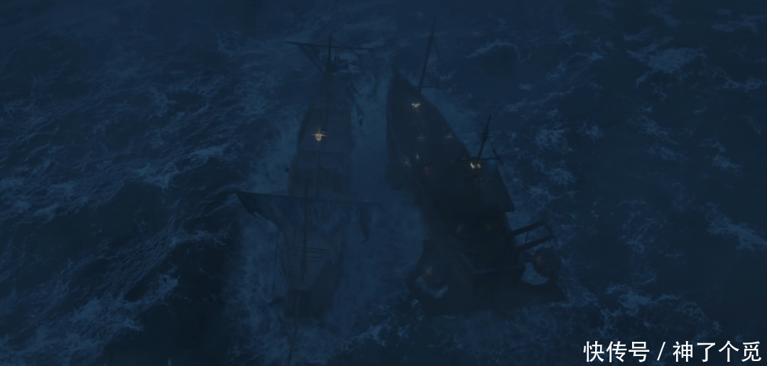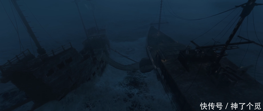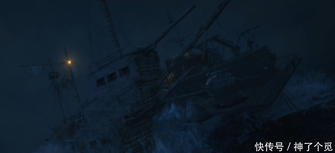 挂在船壁的救生艇被阴魂船拖住,两只船在浪潮中彼此拉扯,前进不得。